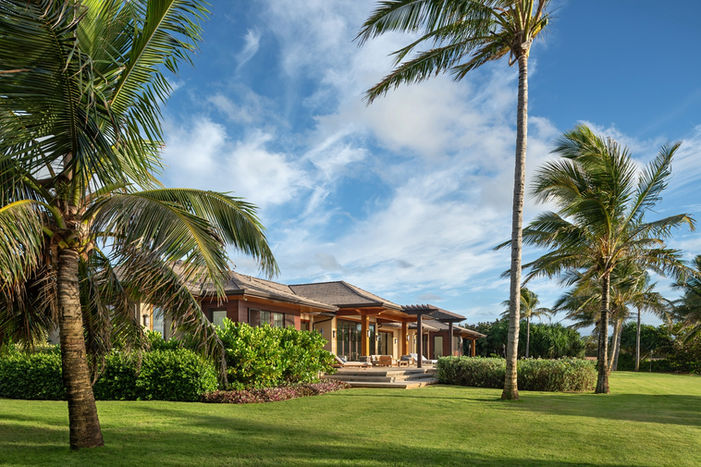 Perched atop an eastern bluff and surrounded by lush tropical landscape, the custom residence captures the spirit of classic Hawaiian Plantation-style architecture, reimagined with modern sensibility. Double-pitched roofs not only enhance the home’s graceful silhouette but also promote natural ventilation, supporting a lifestyle that flows effortlessly between indoors and out.